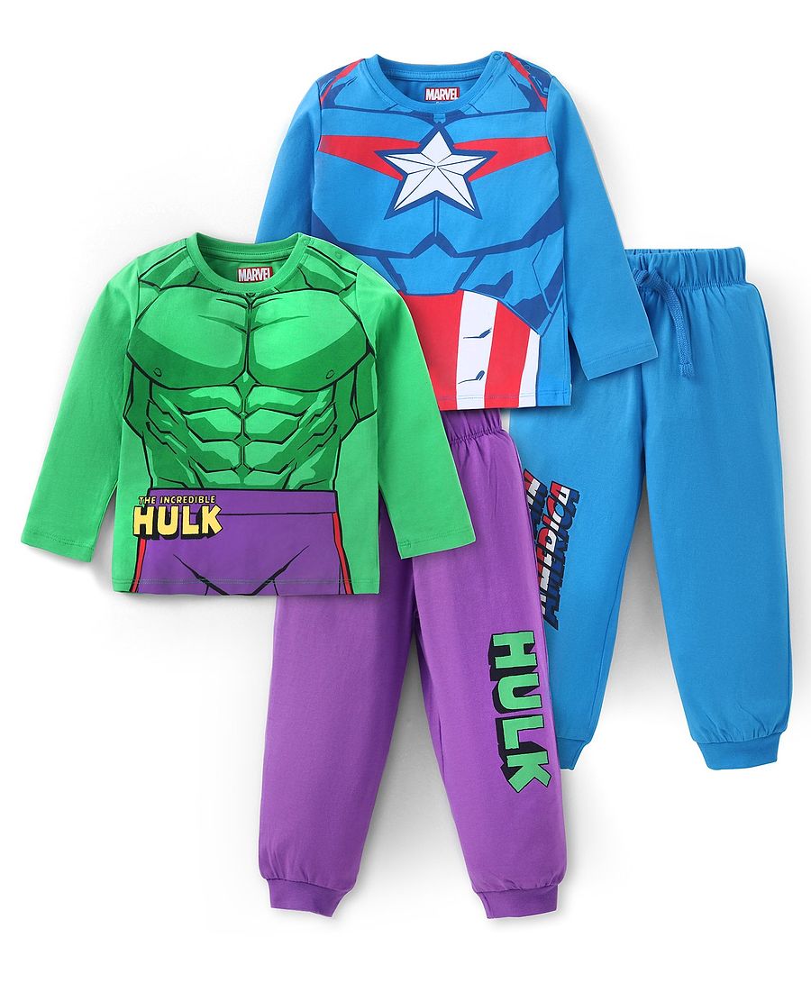 Babyhug Marvel Single Jersey Knit Full Sleeves Night Suit with Avengers Graphics Pack of 2- Blue Green & Purple
