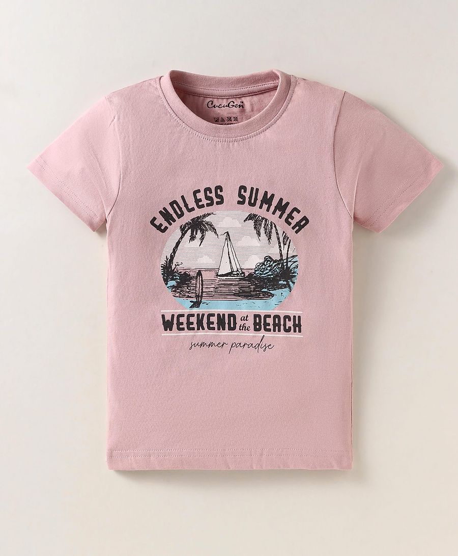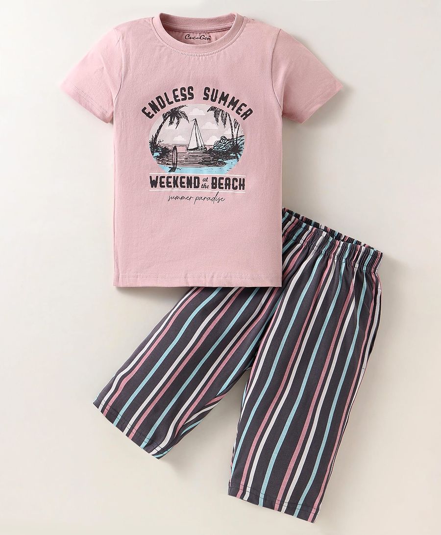 CUCUMBER Sinker Knit Half Sleeves Capri Night Suit With Stripes & Beach Theme Print – Pink