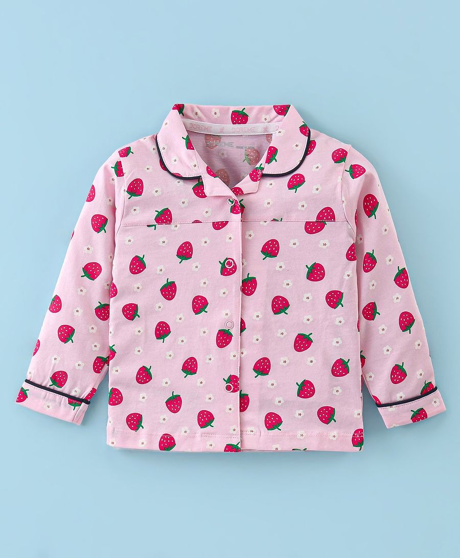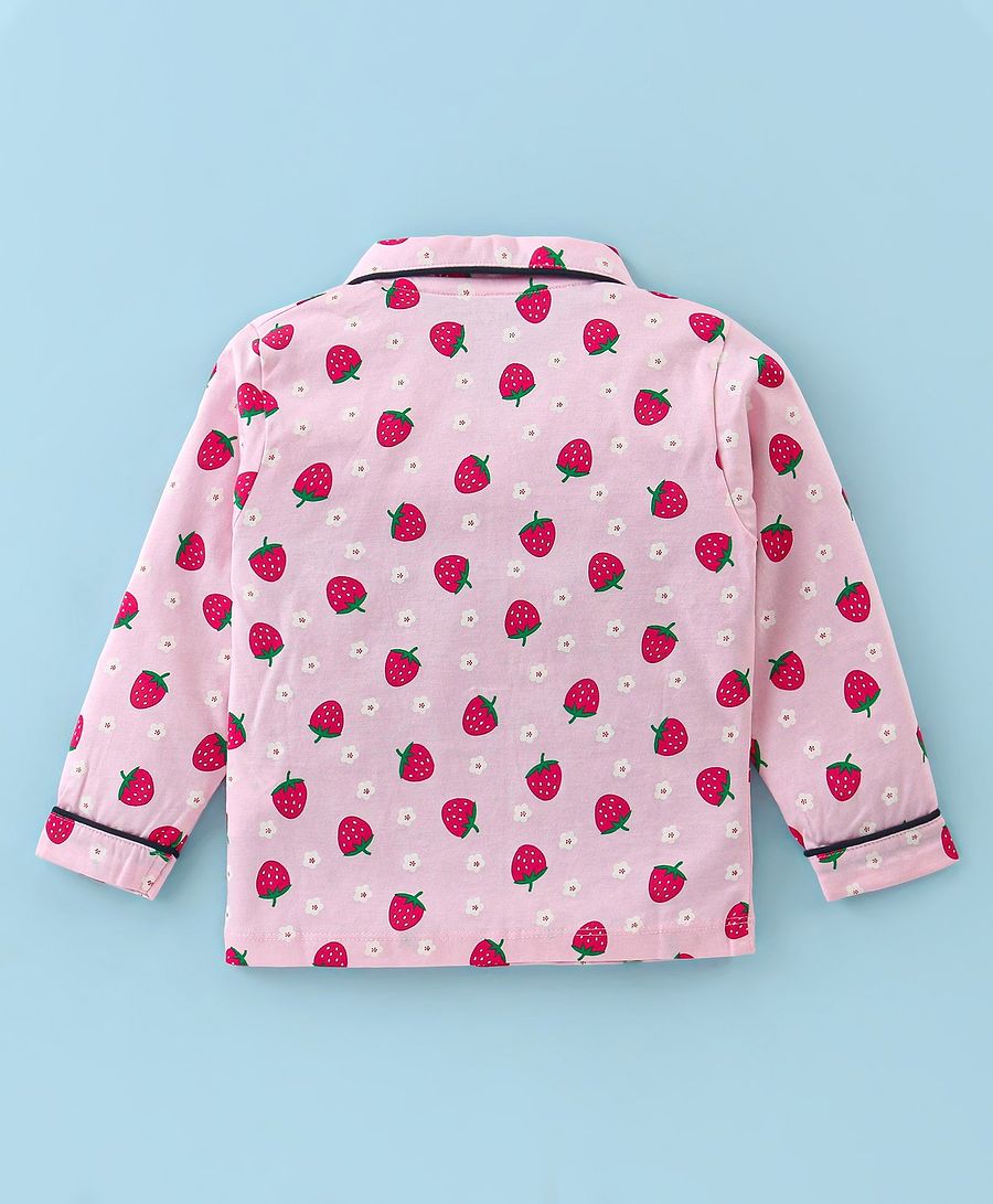 Doreme Single Jersey Knit Full Sleeves Front Open Night Suit With Strawberries & Floral Print – Baby Pink