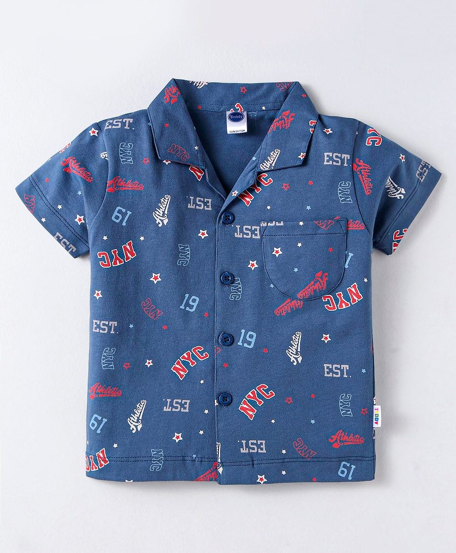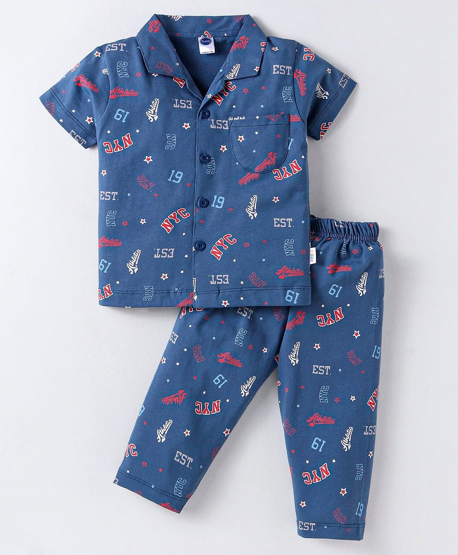 Teddy Sinker Knit Half Sleeves Night Suit with Text Print - Navy Blue